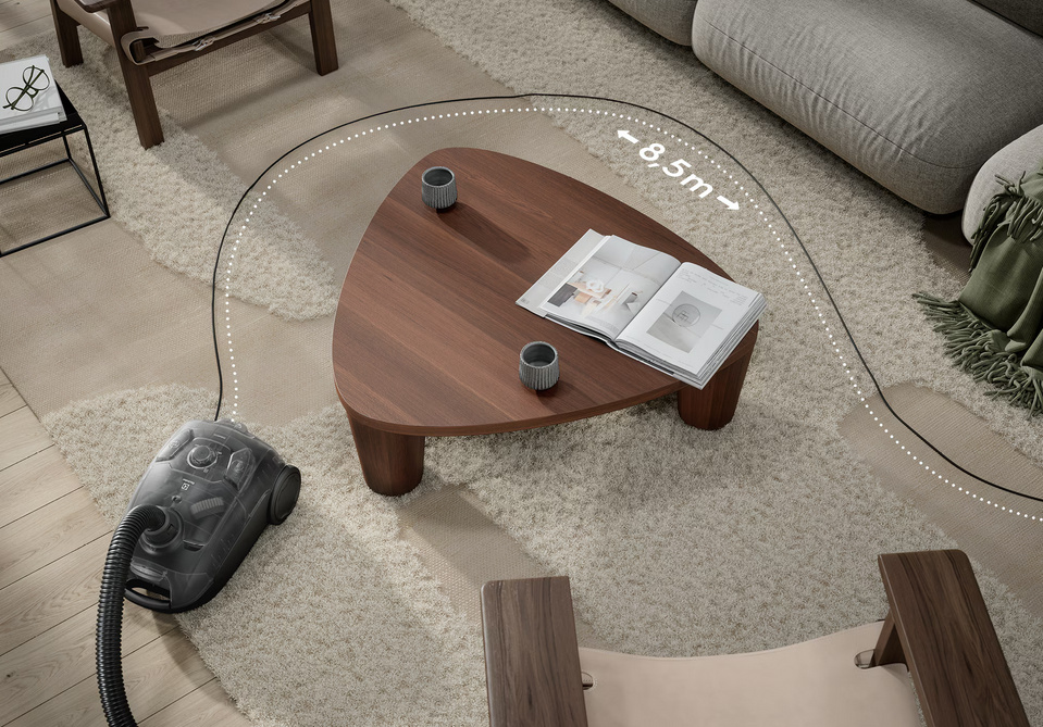 Denne ergonomiske støvsugeren lar deg rengjøre opptil 72 kvadratmeter uten å bytte stikkontakt. Med teleskoprør, store hjul og 8,5 meters rekkevidde kan du bevege deg smidig og rengjøre uten avbrudd.