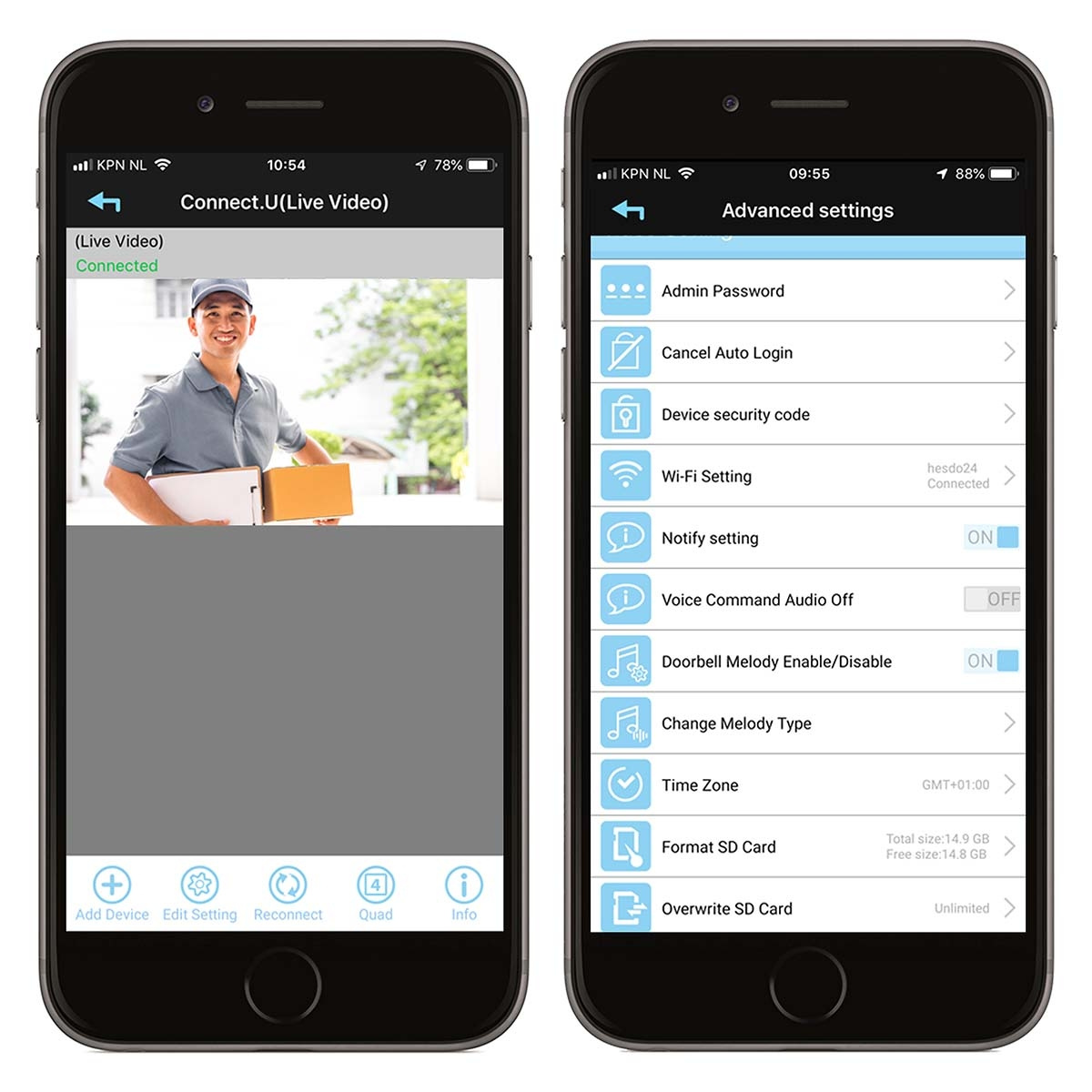 I tillegg til varslingen via appen, vil du selvfølgelig også høre dørklokken ringe hjemme. Du kan velge mellom tre forskjellige ringetoner. Innendørsklokken kan plasseres hvor som helst i huset, innenfor en rekkevidde på 150 meter. Den lades via den medfølgende USB-kabelen. Du kan henge ringeklokken på den solide veggbraketten med det medfølgende monteringsmaterialet. Den har et innebygd oppladbart batteri med en varighet på 6 måneder, som må lades via batteriet. Du vil motta et varsel i appen i tide.