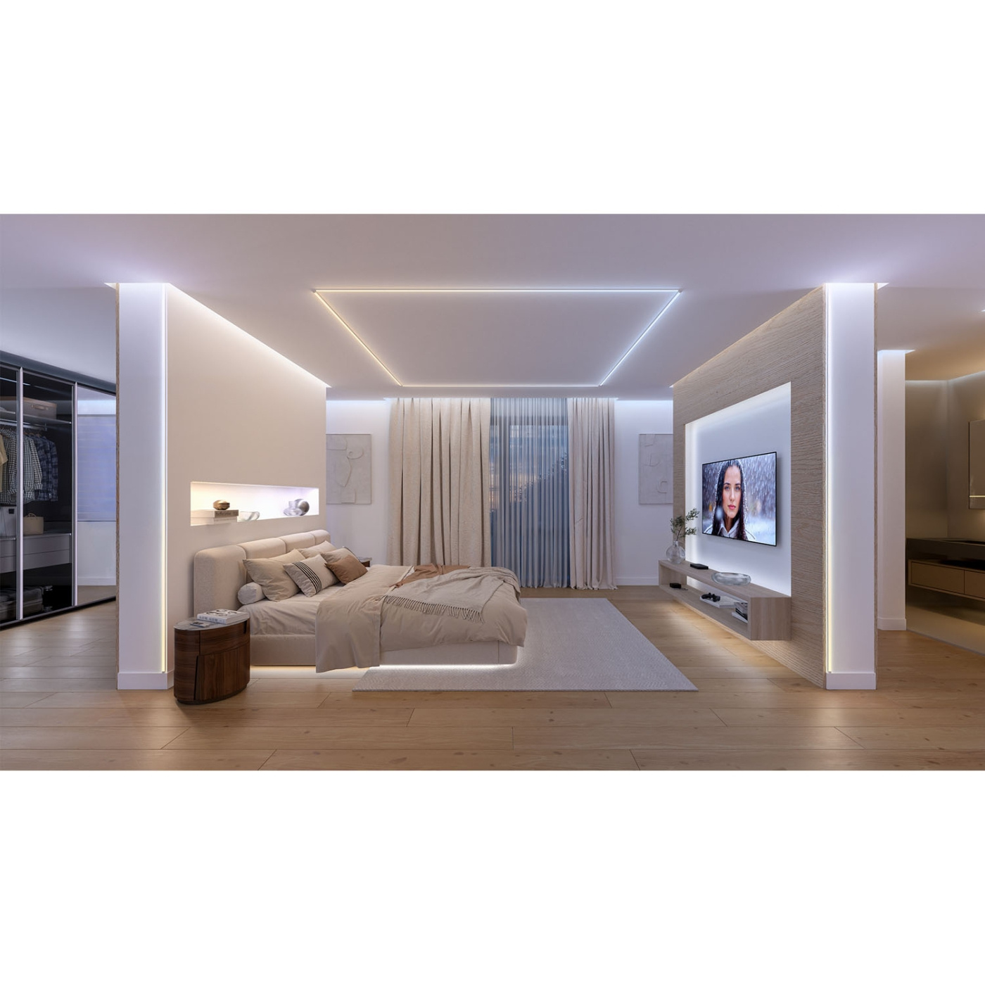 Välj mellan färgglada, stämningsmatchande ljustoner eller äkta vita ljustoner för att skapa den perfekta atmosfären med indirekt sken på väggar, golv och tak. Chomasync™-tekniken ger precision och konsekvent färgblandning för att skapa sömlösa färggradienter i varje hörn. Anpassa rummet med vackra ljusscener och dynamiska effekter för varje stämning och tillfälle. Skär dem så att de passar var som helst – från hörn till väggar och tak till trappor.