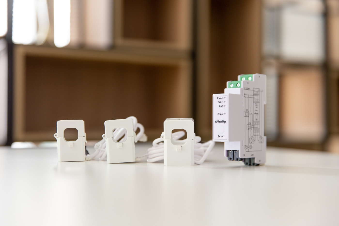 Shelly Pro3 EM er en trefaset energimåler som ved hjelp av transformatoravledere måler energi i tre separate faser med en belastning på opptil 120 A og en nøyaktighet på 99 %. Enheten rapporterer akkumulert energi i sanntid samt øyeblikkelig spenning, strøm og effektfaktor for hver fase. Den lagrer data i et ikke-flyktig minne, som kan hentes frem i opptil 60 dager med 1 minutters intervaller.