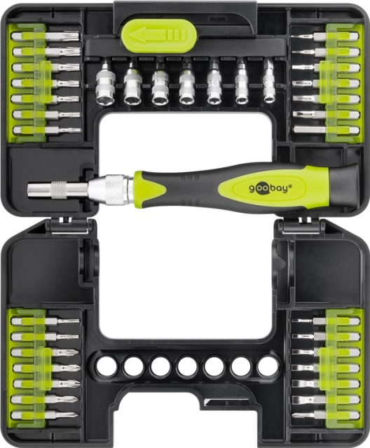 - Inkl. 28 bits: 6 x spor 1 mm, 1,5 mm, 2 mm, 2,5 mm, 3 mm, 3,5 mm, 6 x kryss PH000, PH00, PH0, PH1, PZ0, PZ1, 9 x sekskantstjerne T4, T5, T6, T7, T8, T9, T10, T15, T20, 7 x stikknøkkelhylse H0,7, H0,9, H1,3, H2, H2,5, H3, H4