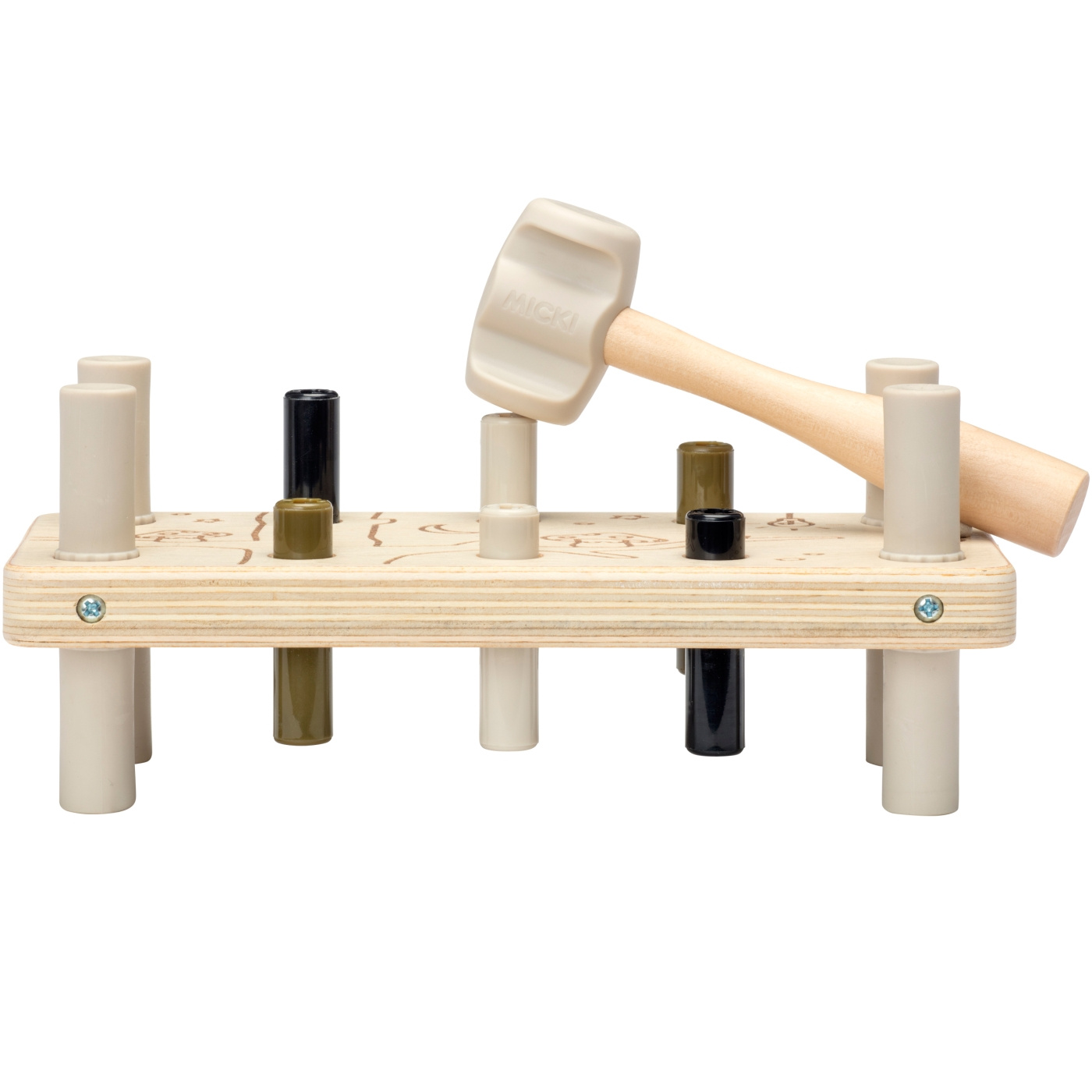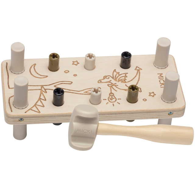 Det ekte premium trebrettet har inngraverte illustrasjoner på begge sider av brettet. Bena og hodet på hammeren er laget av myk plast, noe som gjør den stabil og ikke etterlater merker på overflaten etter at barnet har slått den løs. Hvordan høres det ut når spikrene hamres ned? Nå kan timene med morsom hamring begynne!
