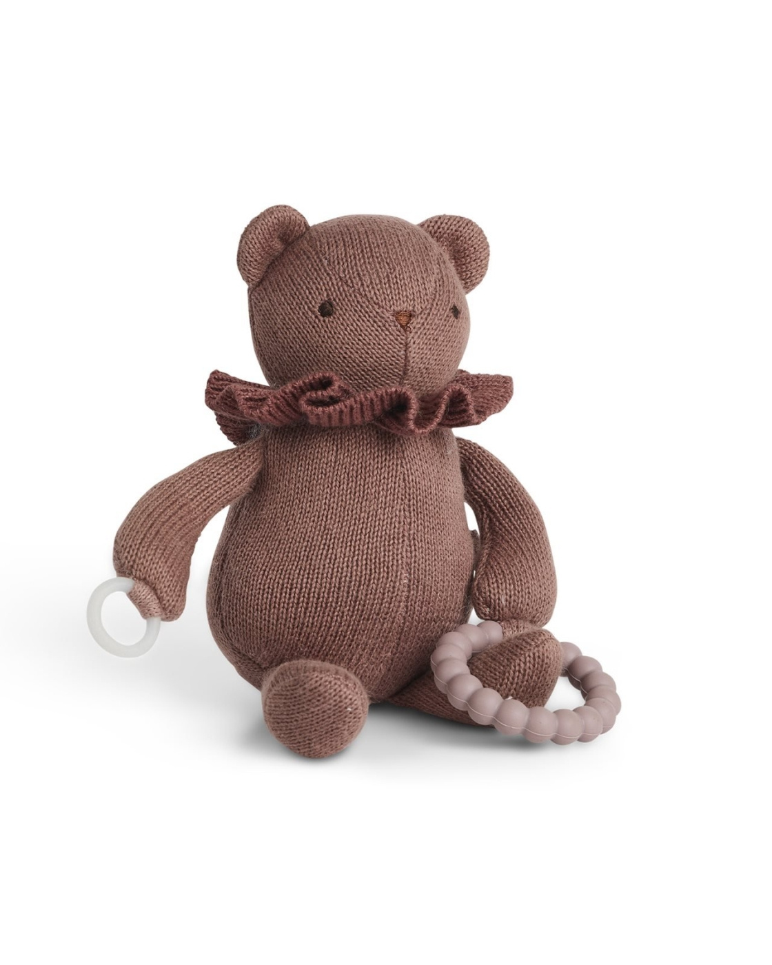 Oppdag Little Activity Bear av Smallstuff i mørk rose, en perfekt følgesvenn for babyen din. Denne 19 cm lange bamsen er strikket i 100 % bomull med PET-fyll fra resirkulerte flasker, og har en smokkholder og en silikonbit for ømme gummer. Den er ideell for nyfødte og er en omtenksom gave som oppfyller STANDARD 100 by OEKO-TEX®.