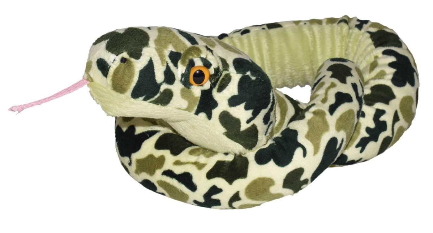 Kose deg med noen på din egen størrelse med denne enorme, utstoppede slangen på 137 cm! Dette lange reptilet uten bein er kledd i grønn camo med myk, lodden pels og en rosa tunge. La deg selv bli pakket inn i moro med denne lange slangen!