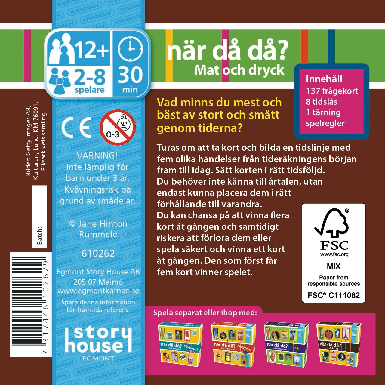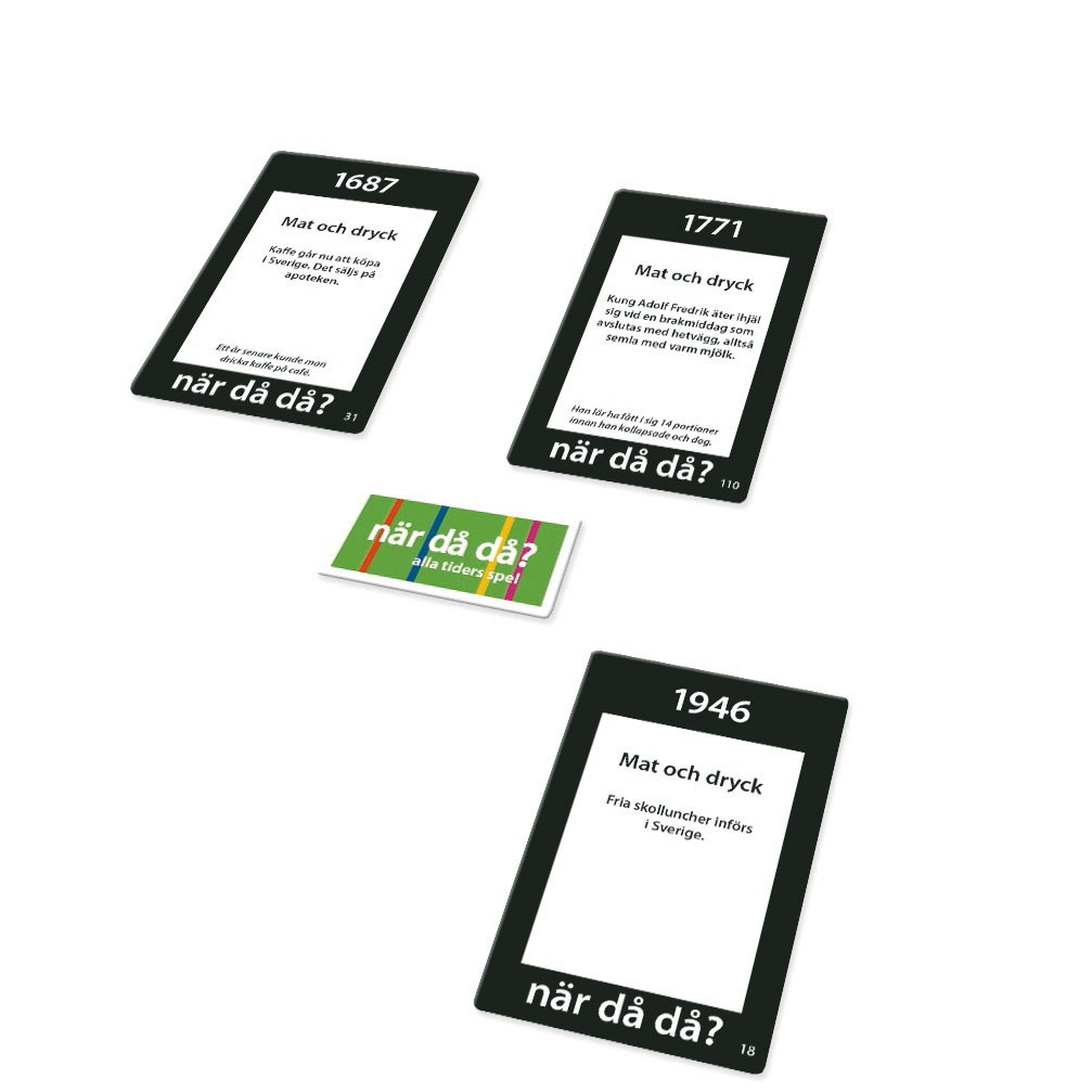 Utfordre hukommelsen og de historiske kunnskapene dine med dette spillet i lommeformat. Spillerne bytter på å trekke kort og lage en tidslinje med fem ulike hendelser fra tidenes morgen til i dag. Målet er å plassere kortene i riktig kronologisk rekkefølge uten å måtte vite de nøyaktige årstallene. Du kan velge å ta sjanser ved å prøve å vinne flere kort på én gang, eller du kan spille på det sikre og vinne ett kort om gangen. Den første spilleren som plasserer fem kort riktig, vinner spillet. Spillet er beregnet for 2 eller flere spillere, og passer for aldre 12 år og oppover, noe som gjør det til en morsom og lærerik aktivitet for familie og venner.