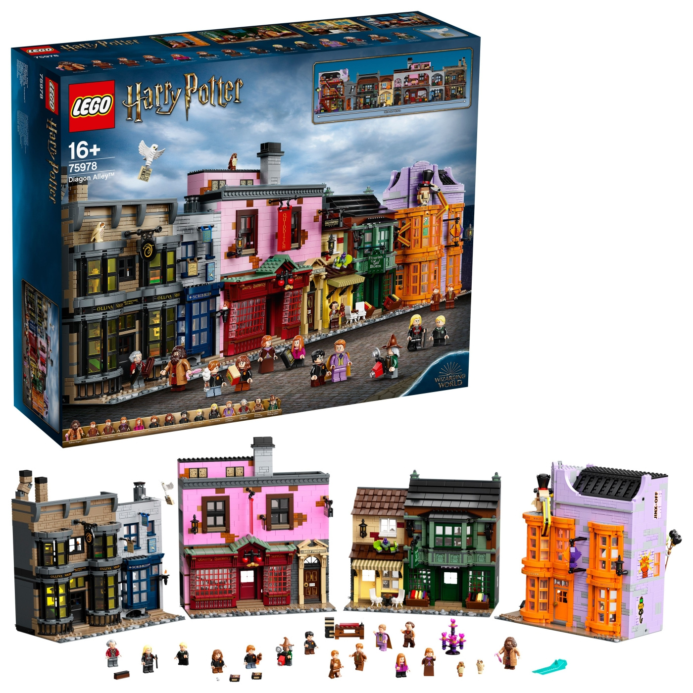 ® Harry Potter™ Diagon Alley™ (75978) er en fantastisk gjengivelse av Londons mest magiske handlegate for fans av Harry Potter-filmene fra 16 år og oppover. Ikoniske butikker fylt med autentiske filmdetaljer. Den imponerende modellen er over en meter bred og gjengir størrelsen og stemningen i det travle sentrumet for magiske artikler. Bak de praktfulle fasadene skjuler det seg spennende interiører, fascinerende detaljer og kjente figurer. Ta en titt på tryllestavene hos Ollivanders™, stikk innom Gilderoy Lockhart™s boksignering hos Flourish & Blotts™ bokhandel, kjøp en kjærlighetsdrikk hos Weasleys' Wizard Wheezes™ og se nærmere på produktene og utstyret hos Scribbulus™ Writing Implements, Quality Quidditch™ Supplies, Florean Fortescues isbar og Daily Prophet™. Kule samleobjekter og byggesett Det omfattende utvalget av «LEGO»-modeller og lekesett gir fans av Harry Potter-universet uendelig fantasifull moro og kreative utstillingsmuligheter.