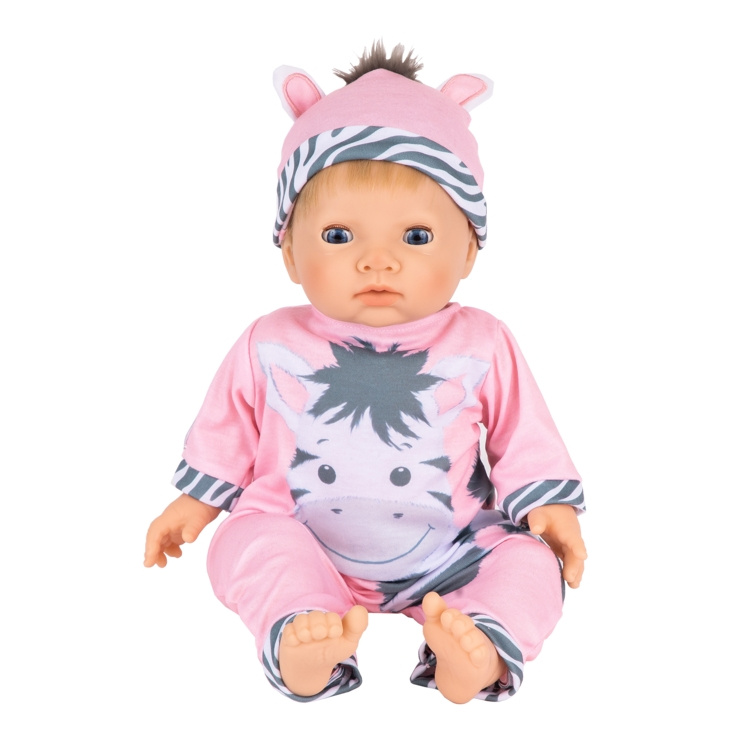Denne nydelige Tiny Treasures babydukken er kledd i et rosa alt-i-ett-antrekk med en søt sebragrafikk og sebramønstrede kanter. Antrekket inkluderer også en matchende rosa jerseyhatt med ører og en fluffy tuft for ekstra søthet.