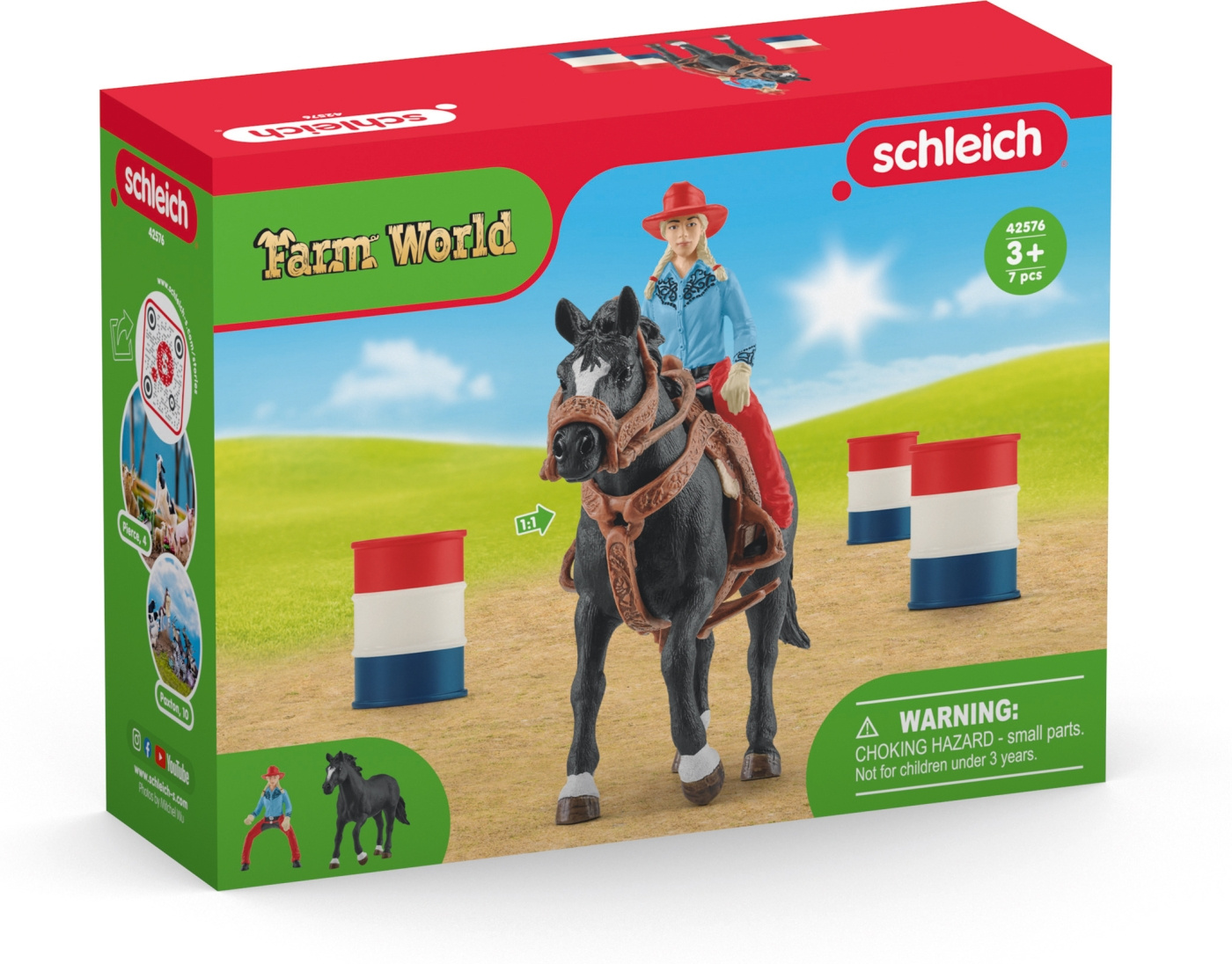 Yeehaw! Nå er det tid for ekte cowboyer og cowgirls. SchleichI ® FARM WORLD barrel racing kan du vise frem dine ferdigheter i westernridning. Appaloosa-hingsten elsker westernsalen og vil stolt bære deg på ryggen gjennom hagen og saloonen. Og hvis du trenger en ekstra utfordring, kan du prøve deg på barrel racing. I det ville vesten ble tønnene satt opp i form av en kløver. Men du trenger kanskje hjelp av en heldig firkløver!