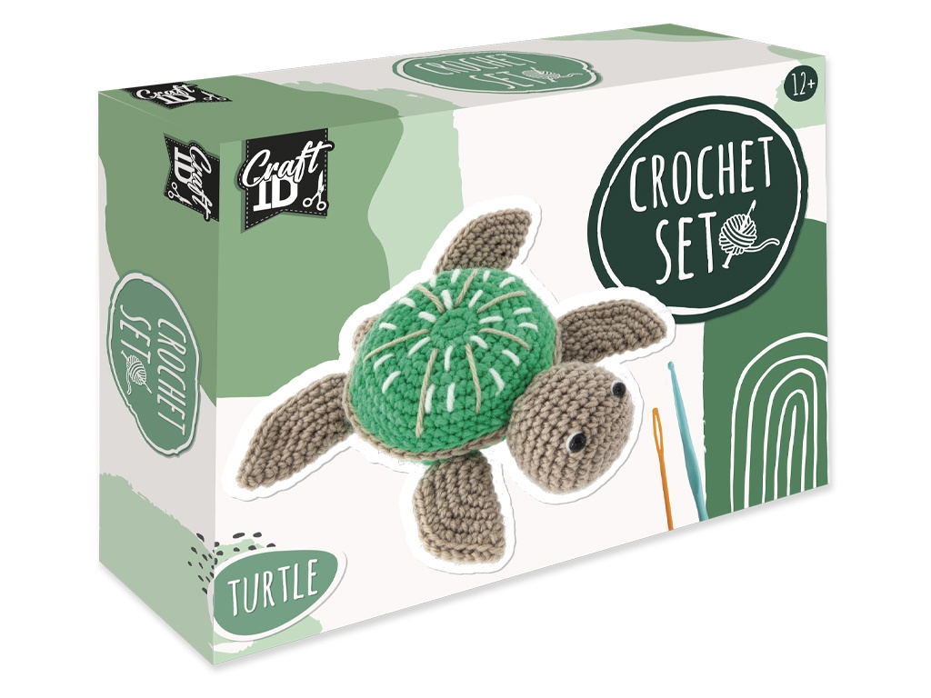 Heklesett, skilpadde. Dette settet inneholder alt du trenger for å hekle en skilpadde. Settet inneholder garn i ulike farger, heklenål, fyll, øyne og nål