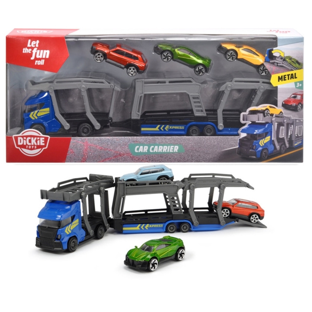 En biltransportør som til og med leveres med tre matchende metallbiler. Denne biltransporteren er designet med stor sans for detaljer, og lever opp til sitt fullskala motstykke når det gjelder utseende og funksjonalitet.