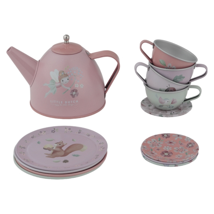 Inviter familien til teselskap. Dette søte tesettet fra Little Dutch er dekorert med de søte illustrasjonene fra Fairy Garden-temaet. Settet inneholder 4 tallerkener, 4 kopper med underkopper og en tekanne