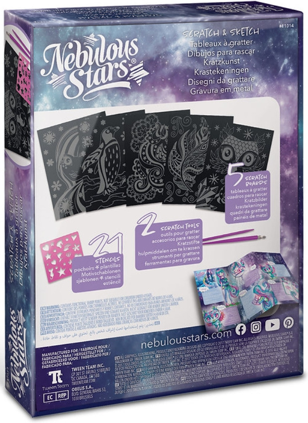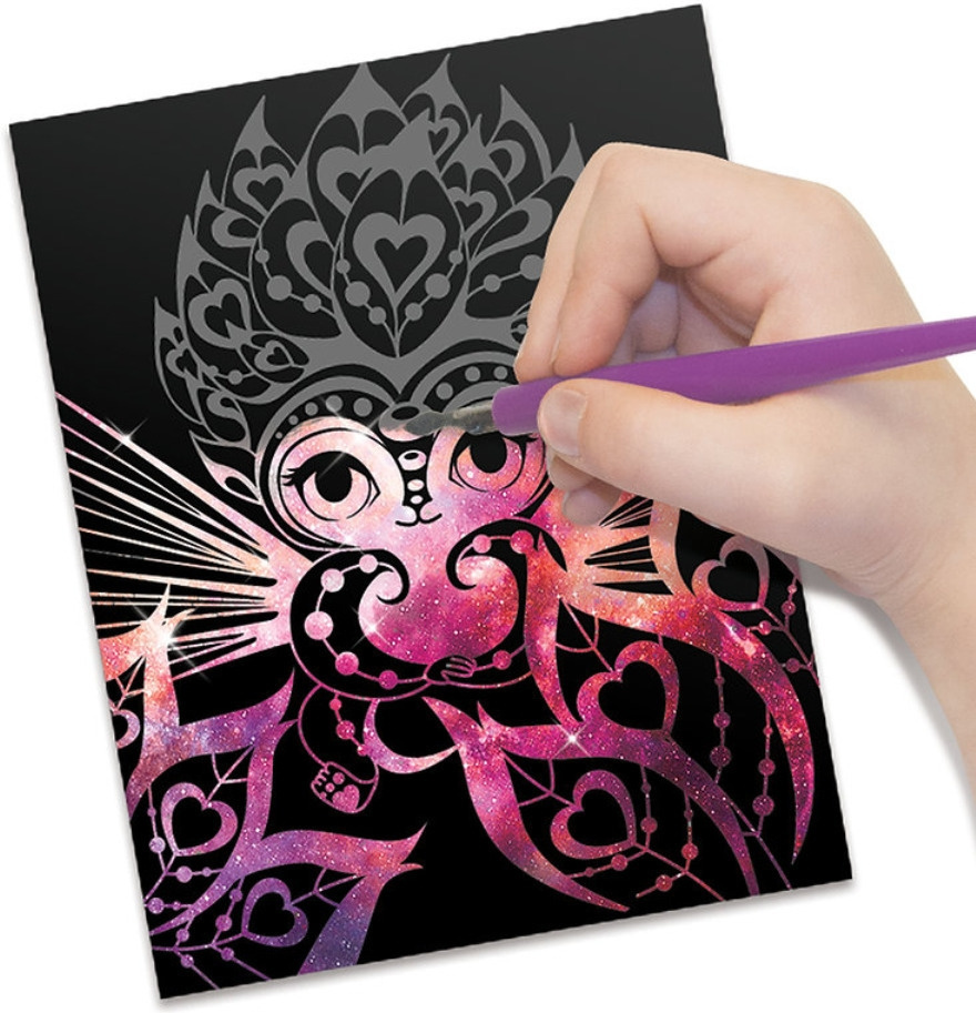 Oppdag en fargerik galakse med stjerner under fem skrapetavler. Nebulous Stars Scratch & Sketch-skrapeloddsettet leveres med former og skrapeverktøy.