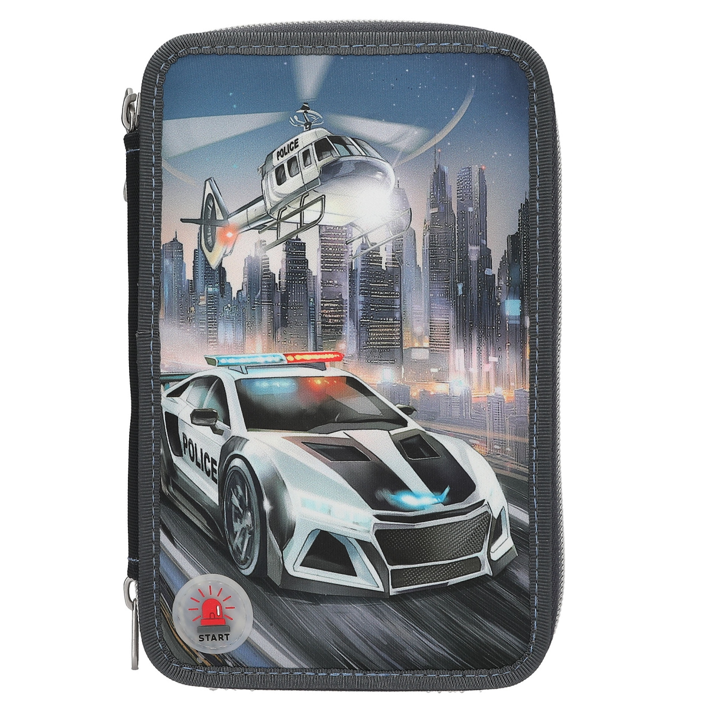 - Iøynefallende motiv: Forsiden av dette pennalet har et dynamisk motiv med en politibil og et helikopter som suser over en nattlig skyline. Det er et design som skriker fart og spenning, perfekt for dem som liker litt adrenalin i skolehverdagen.