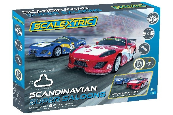 Scalextric Super Saloons-settet inneholder alt du trenger for å kjøre med venner eller familie; bare bygg banen med en av de fire ulike layoutene, og gjør deg klar for det ultimate GT-racet.