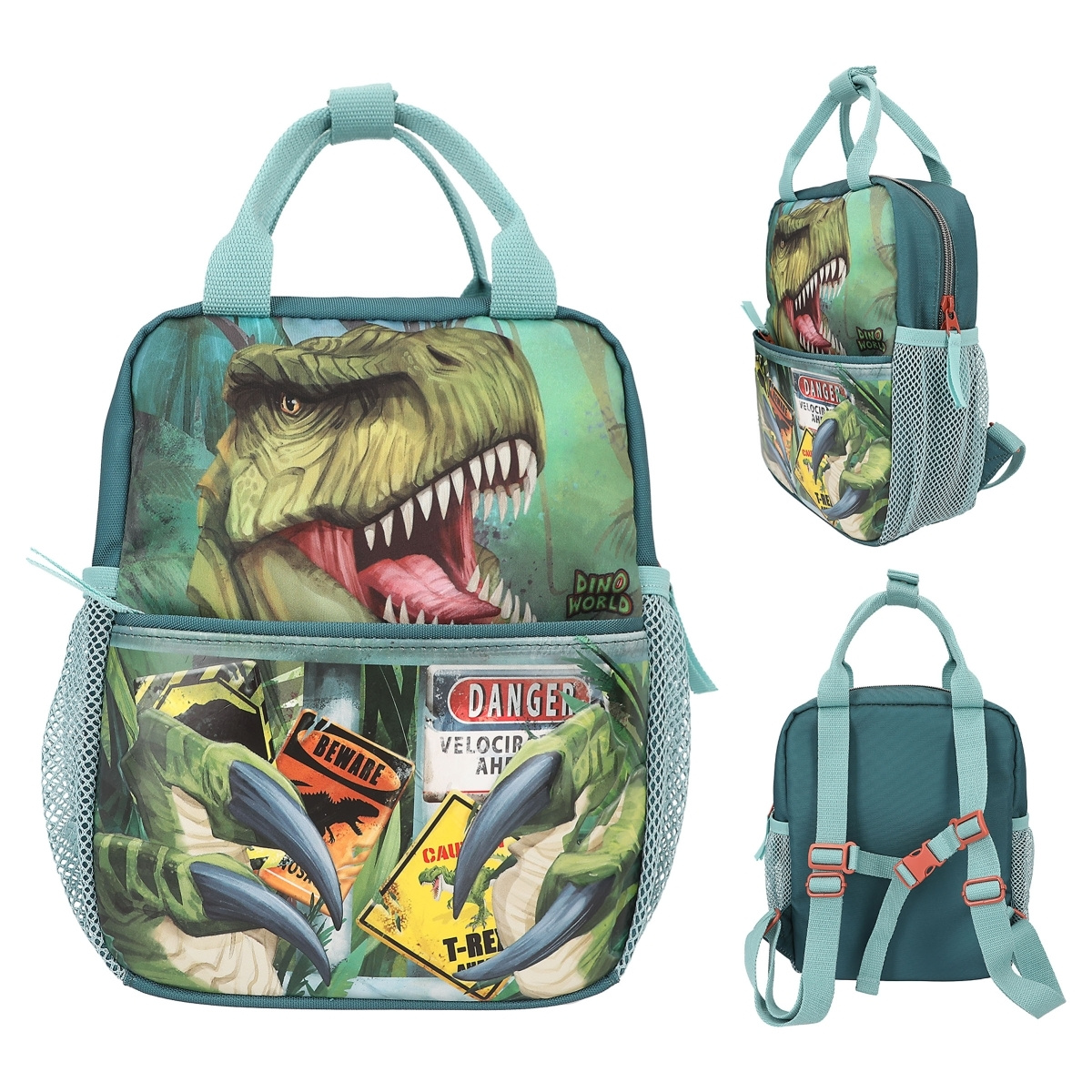 Farlig kul: Den lille ryggsekken fra Dino World har et stort T-rex-motiv på fronten og en påsydd frontlomme med dinosaurklør og lyse advarselsskilt i 3D-look. Flotte mørkegrønne nyanser hele veien rundt, med turkisfargede stropper, håndtak og nettinglommer på siden samt rustrøde detaljer. Fôret på innsiden er trykt med dinosaurbein. Materiale: 100 prosent polyester: 100 prosent polyester