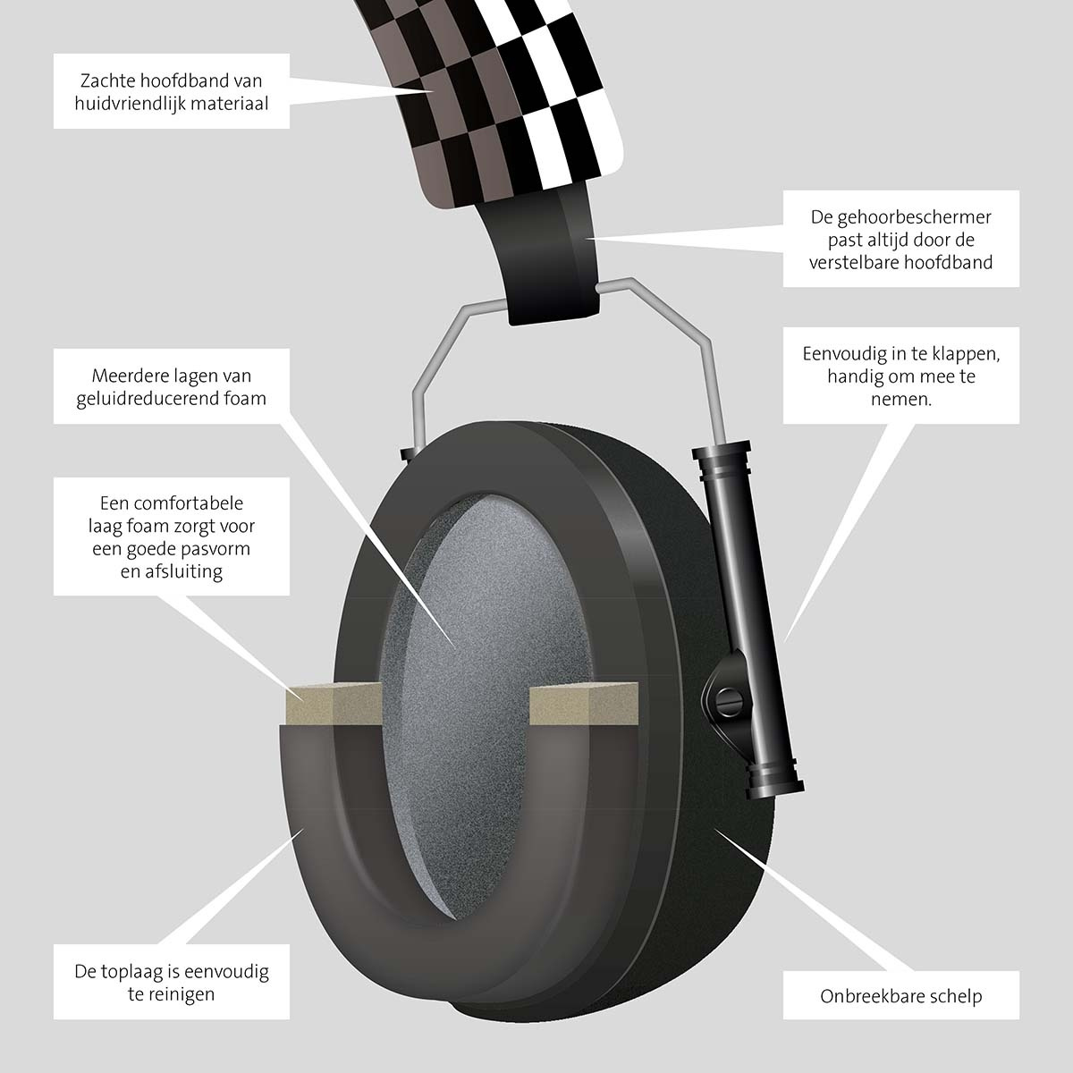 Hørselsvernet, også kjent som en ear defender, er lett og sammenleggbart og derfor enkelt å ta med seg (ideelt for arrangementer og festivaler).