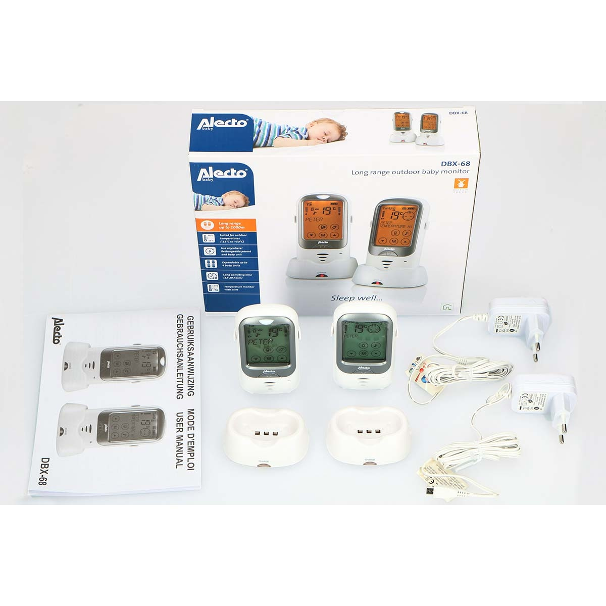 DBX-68 har et oppladbart batteri, ikke bare i foreldreenheten, men også i babyenheten. Ideelt hvis du vil la vognen stå ute når babyen sover for å nyte den friske luften, eller hvis du er på campingtur. DBX-68 er din perfekte følgesvenn.