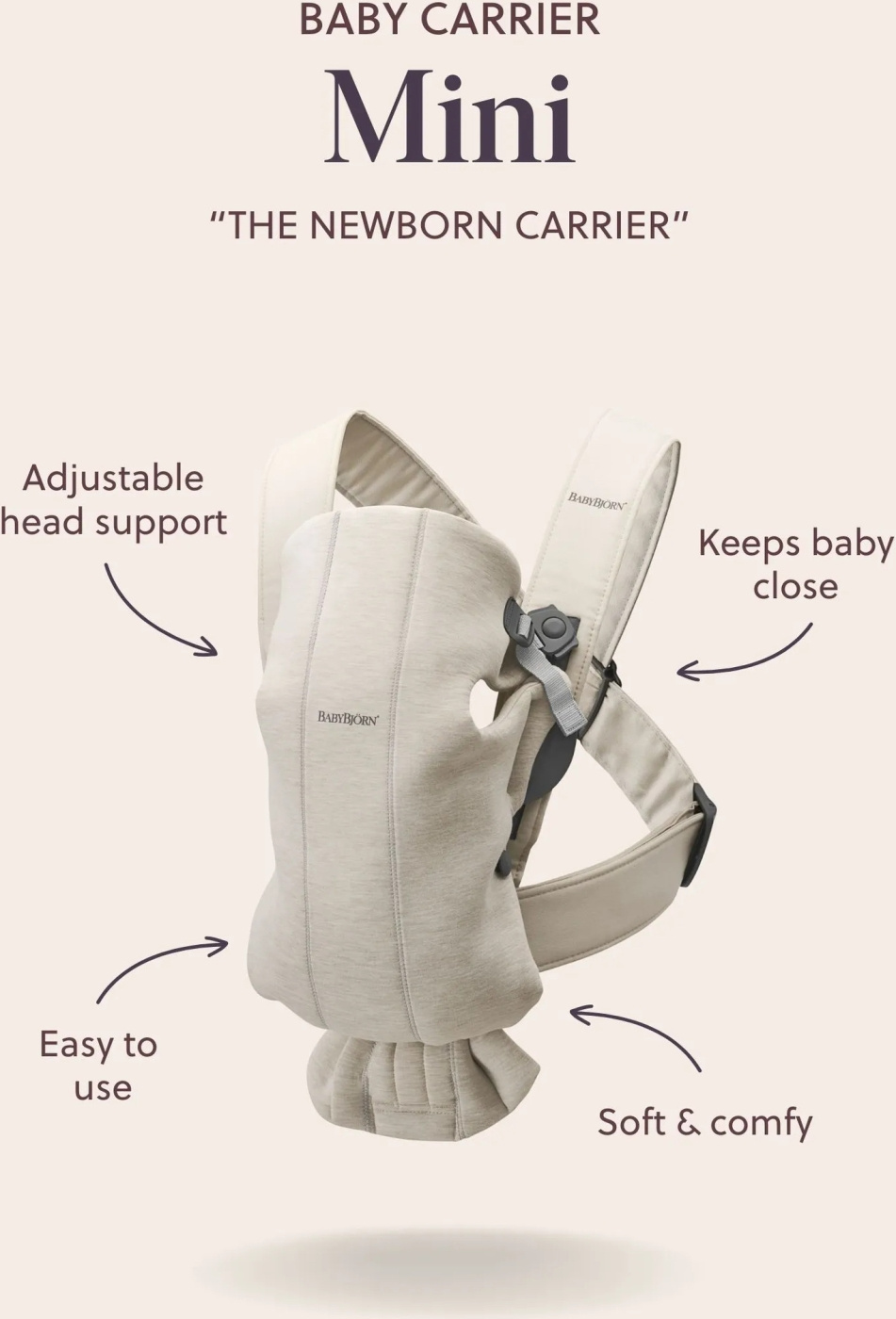 BabyBjörn Mini er en liten, brukervennlig og veldig myk bæresele for nyfødte. Bæreselen er enkel å ta på uten hjelp, og hele frontpanelet er lett å åpne når man skal løfte en sovende baby. De myke, elastiske og nøye utformede stoffene gjør bæreselen til et behagelig og koselig sted for den nyfødte. Babyen din bæres i bæreselen i en ergonomisk komfortabel froskestilling. Barnet kan bæres på forsiden av bæreselen. Babyens ansikt skal alltid være vendt mot bæreselen til han eller hun har lært å bære hodet sitt selv. Ansiktet fremover kan brukes til spedbarn over ca. 5 måneders alder.