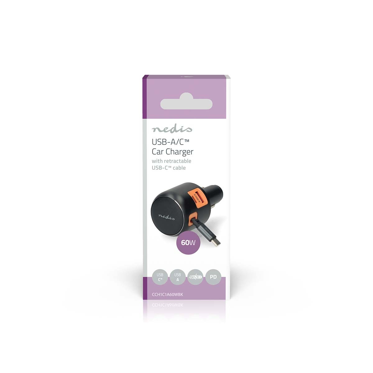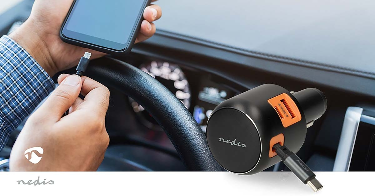 Denne laderen har en USB-C™ Power Delivery-port (30 W) og en USB-A-port (30 W), som begge støtter hurtiglading for de nyeste Apple- og Android-enhetene. Den integrerte USB-C™-inntrekkbare kabelen støtter også 30 W utgangseffekt og strekker seg opp til 70 cm, og trekkes deretter inn med et enkelt rykk - slik at bilinteriøret holdes ryddig og uten floker.
