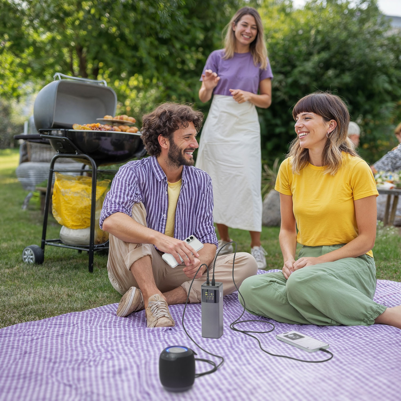 Med to USB-C-porter og én USB-A-port kan powerbank lade opptil tre enheter samtidig. For optimal ladehastighet gir en enkelt USB-C-port hele 200 watt, mens bruk av begge USB-C-portene deler effekten til 100 watt hver. USB-A-porten gir ytterligere 18 watt, noe som sikrer effektiv lading av alle enhetene dine.