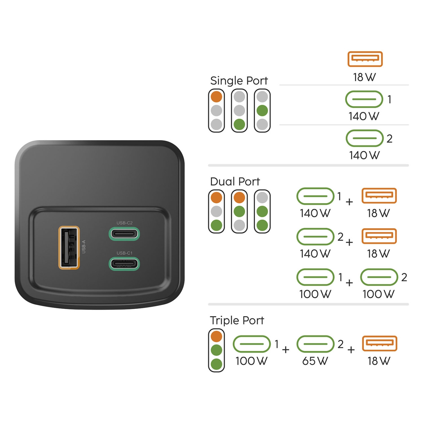 - 2x USB-C- og 1x USB-A-porter