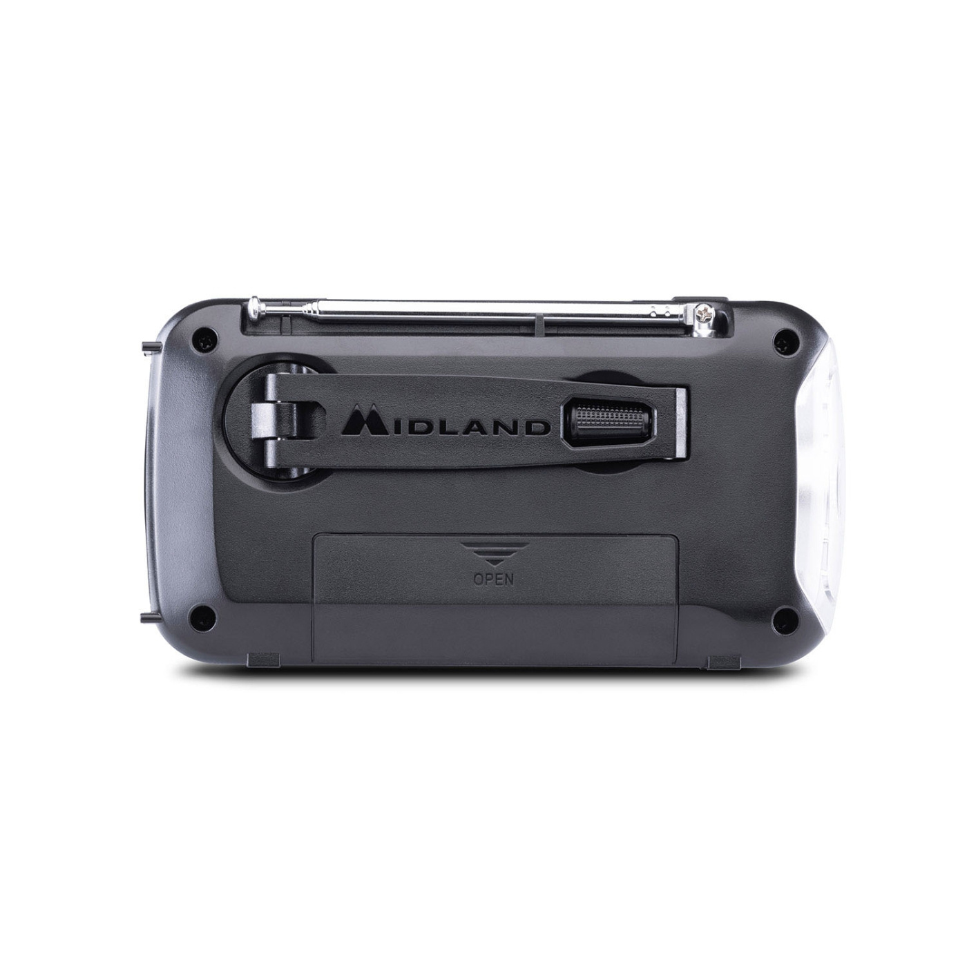 MIDLAND-enheten kombinerer radio, strømbank og LED-lommelykt for allsidig bruk.