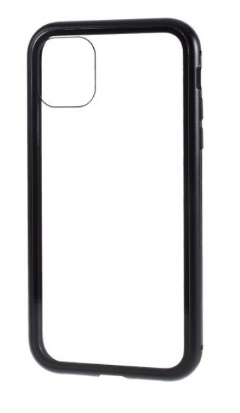 Stilig mobildeksel til iPhone 11 Pro Max. Baksiden av etuiet er i gjennomsiktig herdet glass, og kantene er i svart metall.