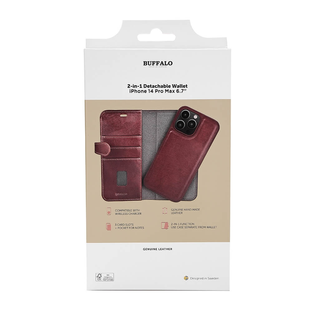 Buffalo lommebok er designet i Sverige og laget av anilinskinn av førsteklasses kvalitet. Den har tre kortlommer og en seddellomme. Et hull for fingeren gjør det enklere å ta ut et kredittkort. En magnetisk knapp holder lommeboken lukket. Hull for høyttaleren gjør det mulig å ha en samtale mens lommeboken er lukket. Smarttelefonen er beskyttet i et magnetisk deksel som kan tas ut av lommeboken, og dekselet har samme eksklusive bøffelskinn på baksiden.
