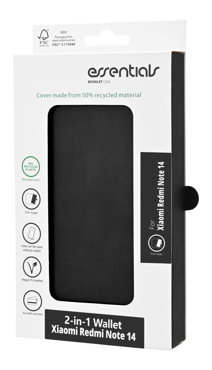 Essentials Xiaomi Redmi Note 14 PU-plånbok, avtagbar, 3 kort, svart