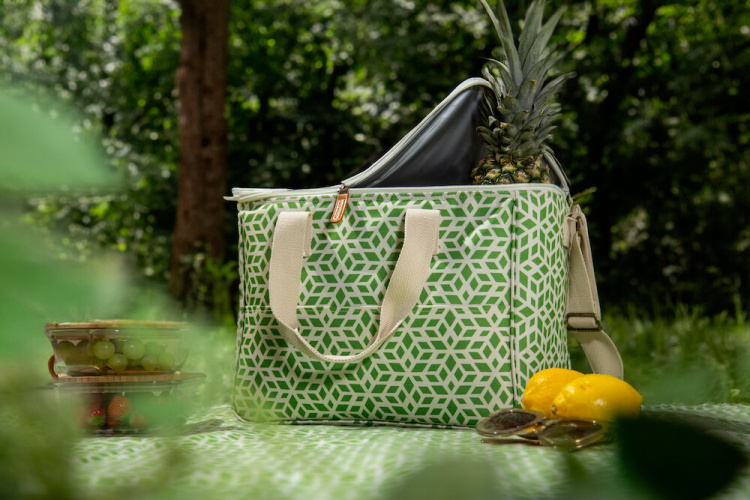 Kjølebagen holder seg kald lenge takket være den tykke PEVA-polstringen, som også er lett å tørke av. Den er laget av resirkulert materiale fra PET-flasker, med håndtak og skulderrem i bomull og kunstlær.