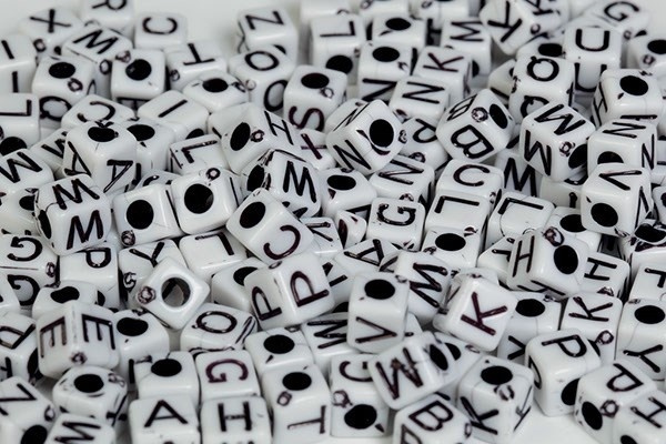 Bokstavperler. Egner seg til å tre på elastisk tråd. Perfekt til å lage halskjeder og armbånd.