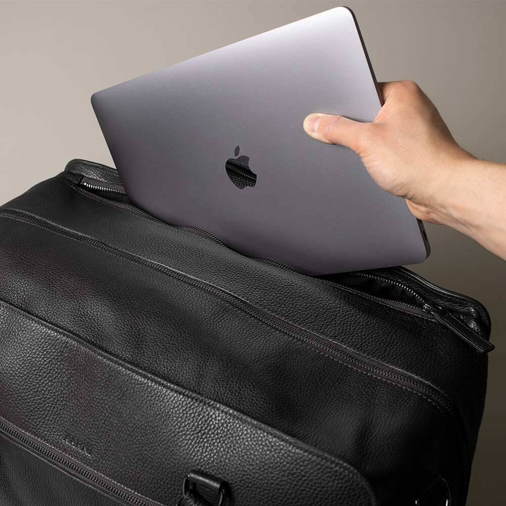 - Laget av nordisk lær av høy kvalitet, med en lomme for oppbevaring av en bærbar datamaskin