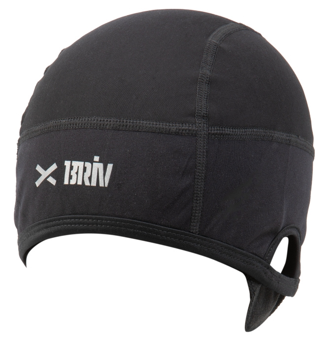 Løpehette, eller hjelmhette, i svart polyester med refleks og åpning for hodetelefoner.