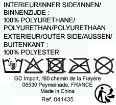 - Materiale: 100 % polyester (utside), 100 % polyuretan (innside).
